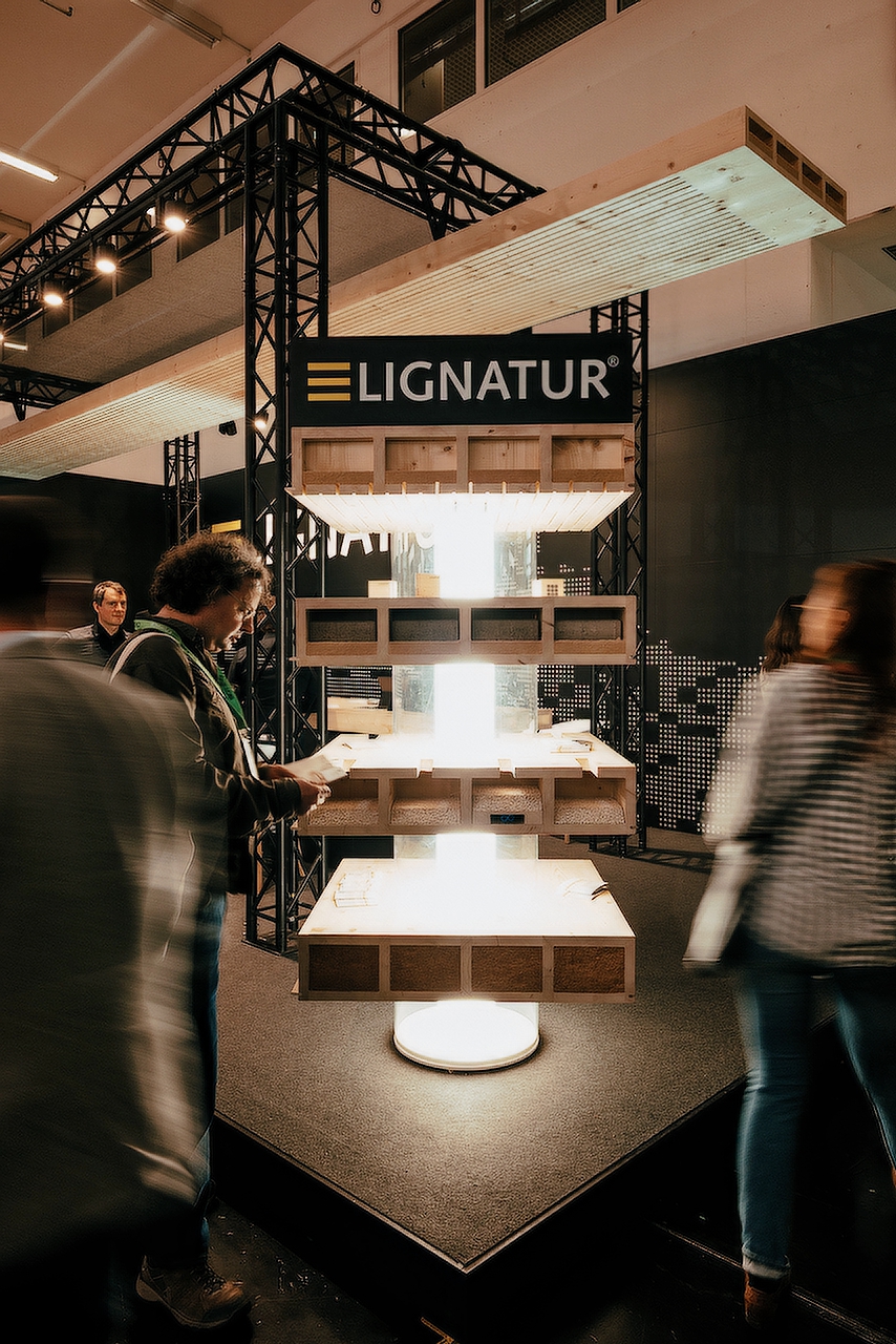Ein weiteres Highlight bot der ausgestellte Musterturm mit den übereinander, auf Plexiglasringen gelagerten LIGNATUR-Elementen. (Be)greifen - so die Devise.