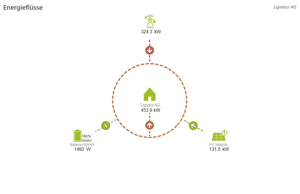 Sämtliche Parameter können in Echtzeit überwacht und gesteuert werden. In der Mitte ist der Verbrauch in der Produktion von LIGNATUR ersichtlich, aussen die drei Stromquellen: PV-Anlage, Batterie und die SAK (St.Gallisch-Appenzellische Kraftwerke AG). Im obigen Beispiel, aufgenommen im Februar 2024, liefern PV-Anlage und Batterie 29% bzw. 0% des Stromverbrauchs.