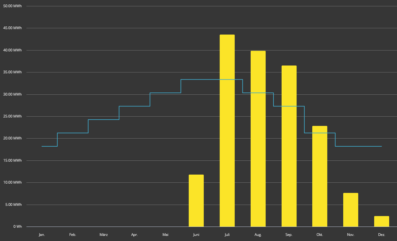 Da auch in Waldstatt keine Laborbedingungen herrschen, weicht die tatsächliche von der theoretischen Leistung ab. Unter Berücksichtigung der Lage ist eine Leistung von 230 kWh möglich, wodurch ein Autarkiegrad von zirka 25% erreicht werden kann. Obige Darstellung der ersten fünf Monate zeigt, dass die Leistungsprognose des Lieferanten dank viel Sonnenschein im Sommer und Herbst deutlich übertroffen wurde.