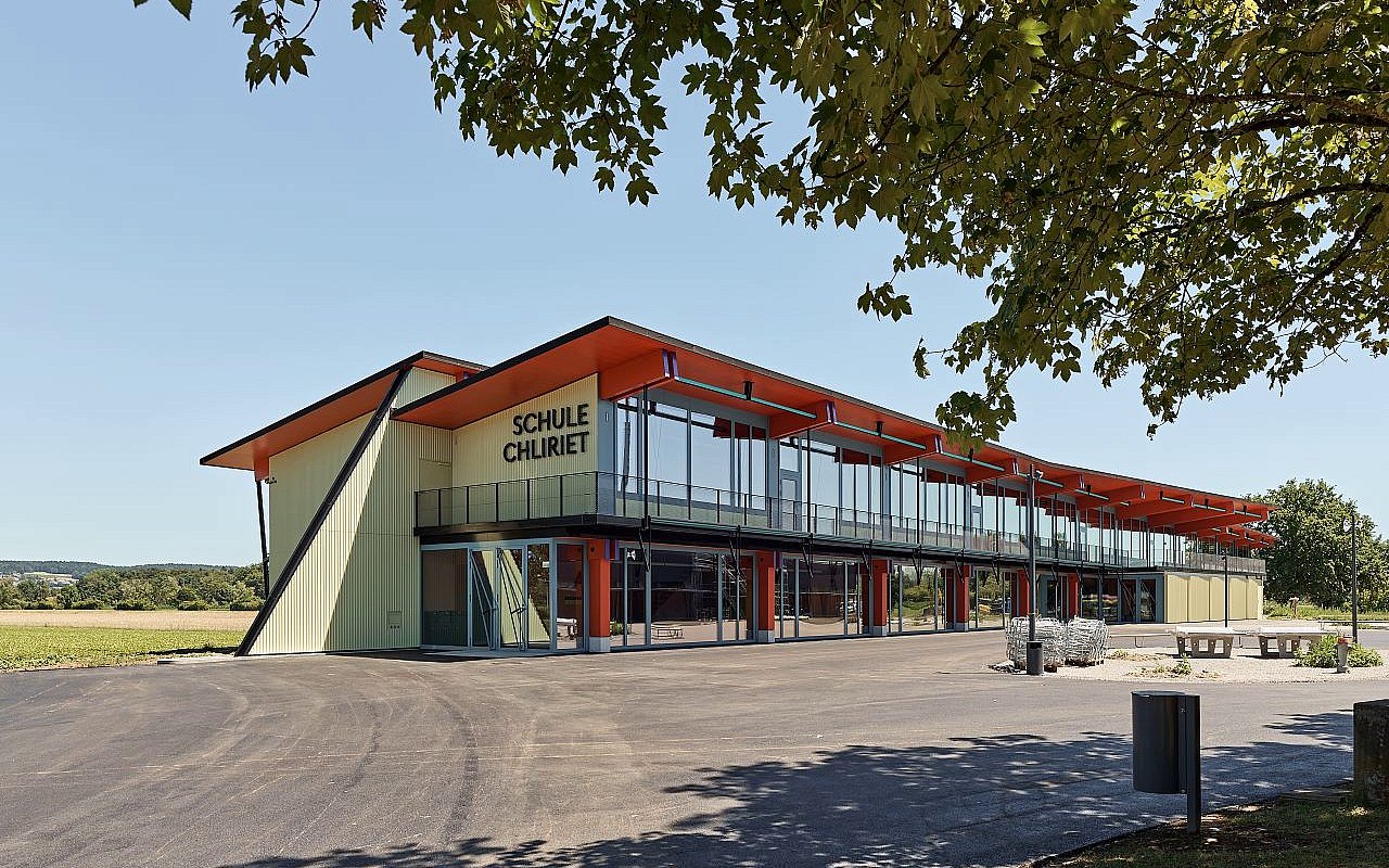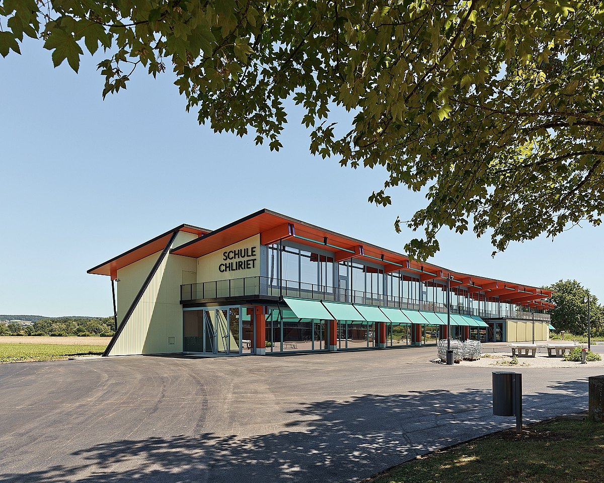 Die Schulanlage Chliriet liegt zwischen den Gemeinden Rümlang und Oberglatt. Das neue Schulgebäude ergänzt das offene, von der Landschaft geprägte Gefüge im Chliriet mit einer bestehenden Mehrzweckhalle, den Sportanlagen und alten Bäumen. Es steht als rund 100 m langes und nur 17 m breites sowie mit zwei Geschossen flaches Haus am begrenzenden Flurweg und spannt mit der Mehrzweckhalle einen grossen Pausen- und Zugangsraum auf. Der schwungvoll ausladende Dachüberstand trägt zu dieser Fassung bei und verleiht der Architektur ihren eigenen Ausdruck.