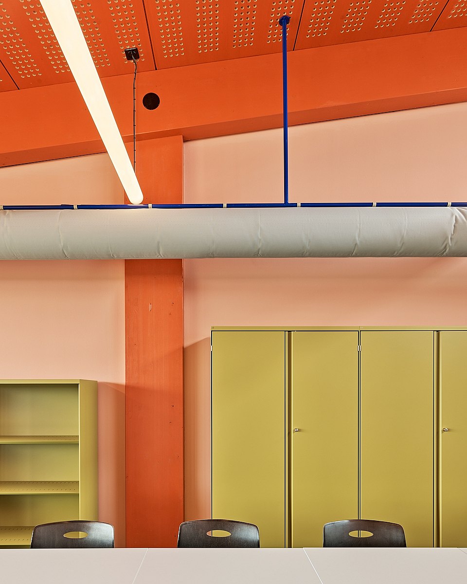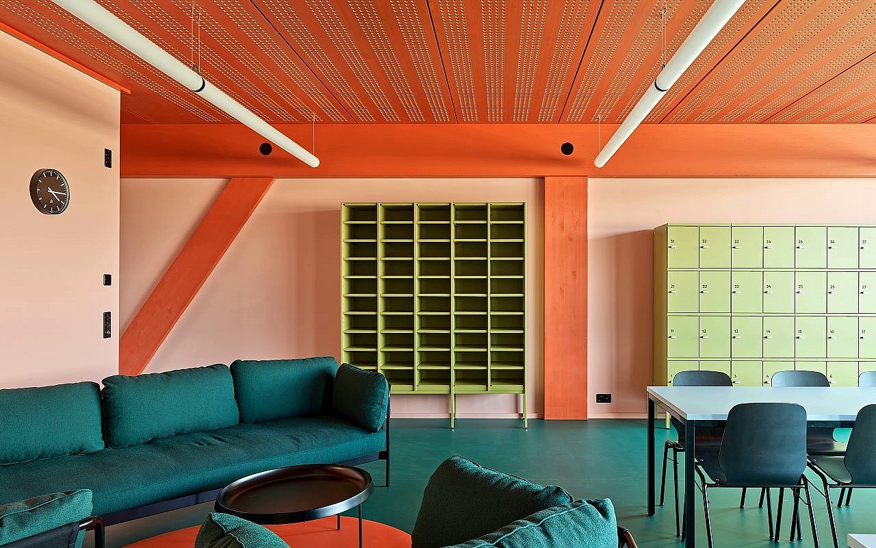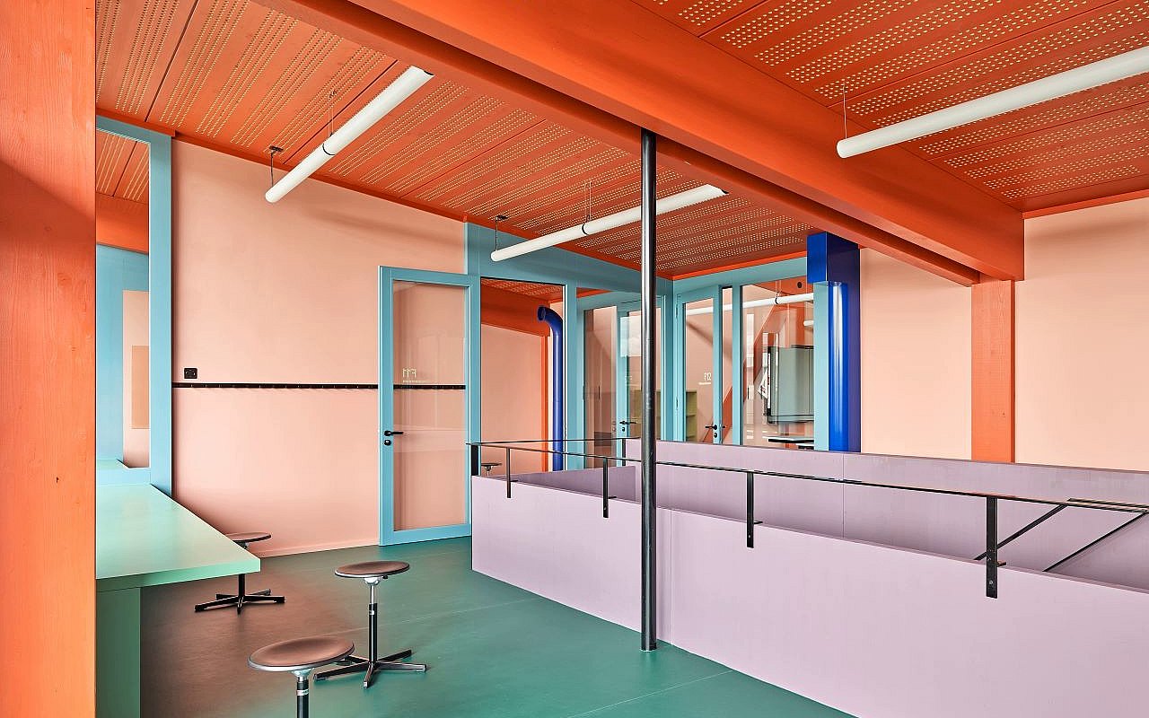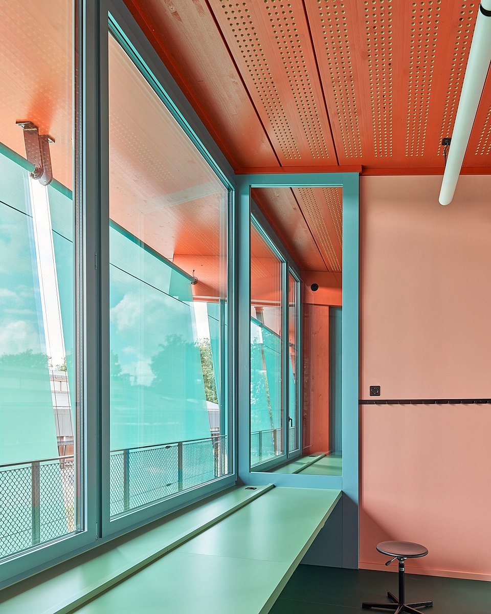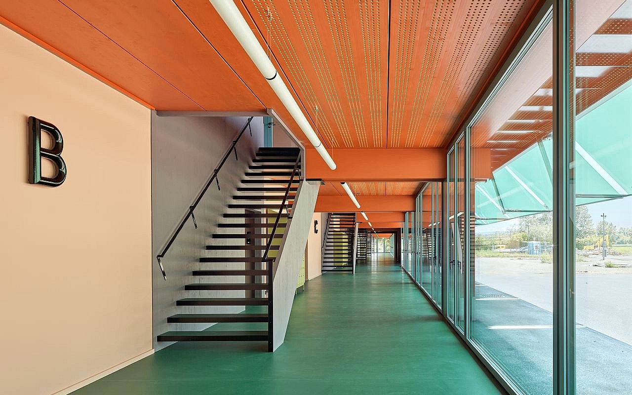 Teil dieses Konzepts sind auch die Decken- und Dachelemente von Lignatur, die mit Längen von bis zu 7,60 m die verschiedenen Räumlichkeiten überspannen. Während die 24 cm hohen Flächenelemente (LFE 240) für das Dach entsprechend ausgedämmt und mit einer unterseitigen Profilierung des Akustik Typ 3.1 sowohl für den erforderlichen Wärmeschutz als auch für eine optimale Raumakustik in den verschiedenen Bereichen des Schulhauses sorgen, liefert die 36 cm dicke Geschossdecke mit eingelegten Tilgersteinen (LFE 360 mit silence12) den erforderlichen Schallschutz zwischen den zwei Geschossen. Ebenfalls mit einer unterseitigen Profilierung des Akustik Typ 3.1 ausgestattet, ermöglichen auch diese Elemente eine entsprechend gute Schall-Absorption und Raumakustik.