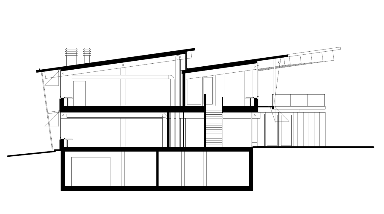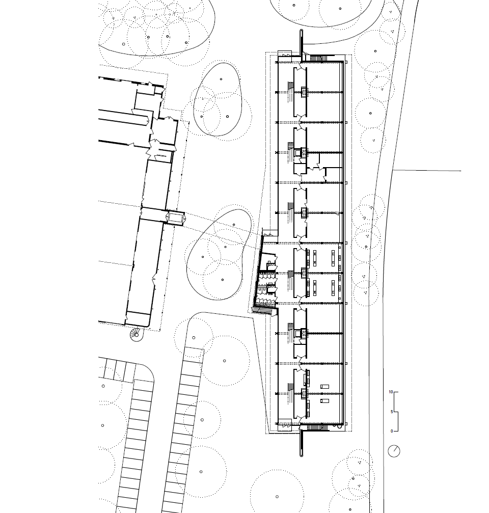 Das Sekundarschulhaus ist als Siegerentwurf aus einem anonymen Projektwettbewerb hervorgegangen. Der zweibündig organisierte Holzskelettbau erhielt zwei Pultdächer, die in der Gesamtschau ein Sheddach bilden. In den Querachsen finden jeweils einbündig die Unterrichtsräume Platz.