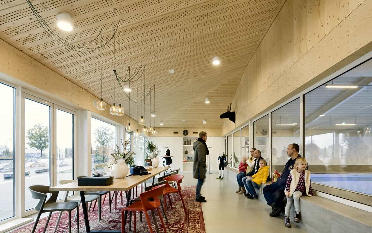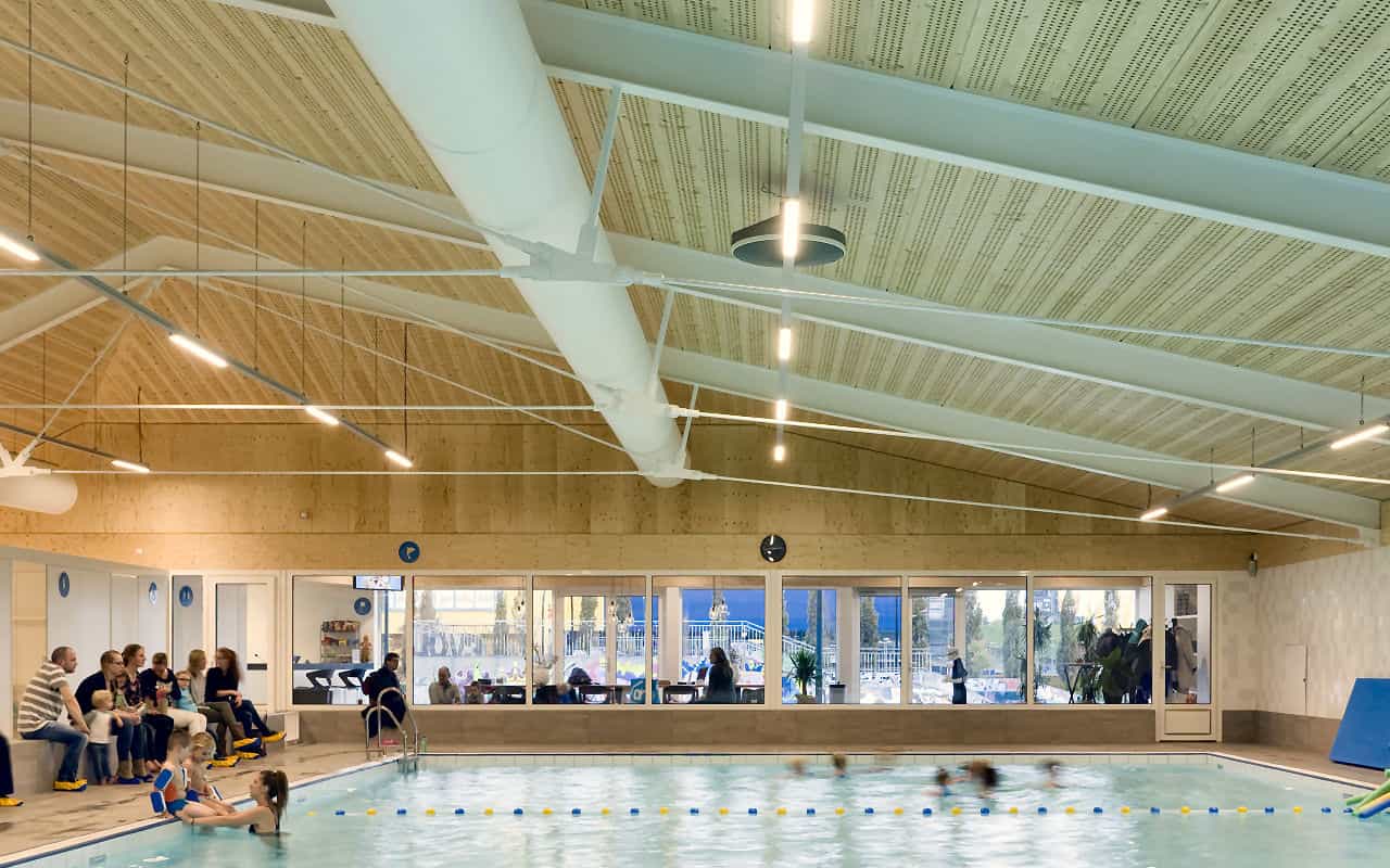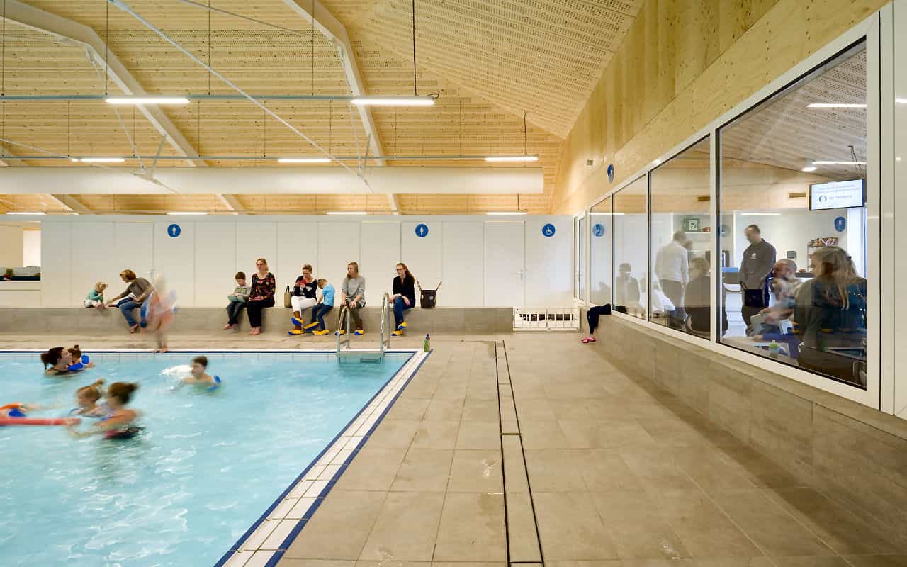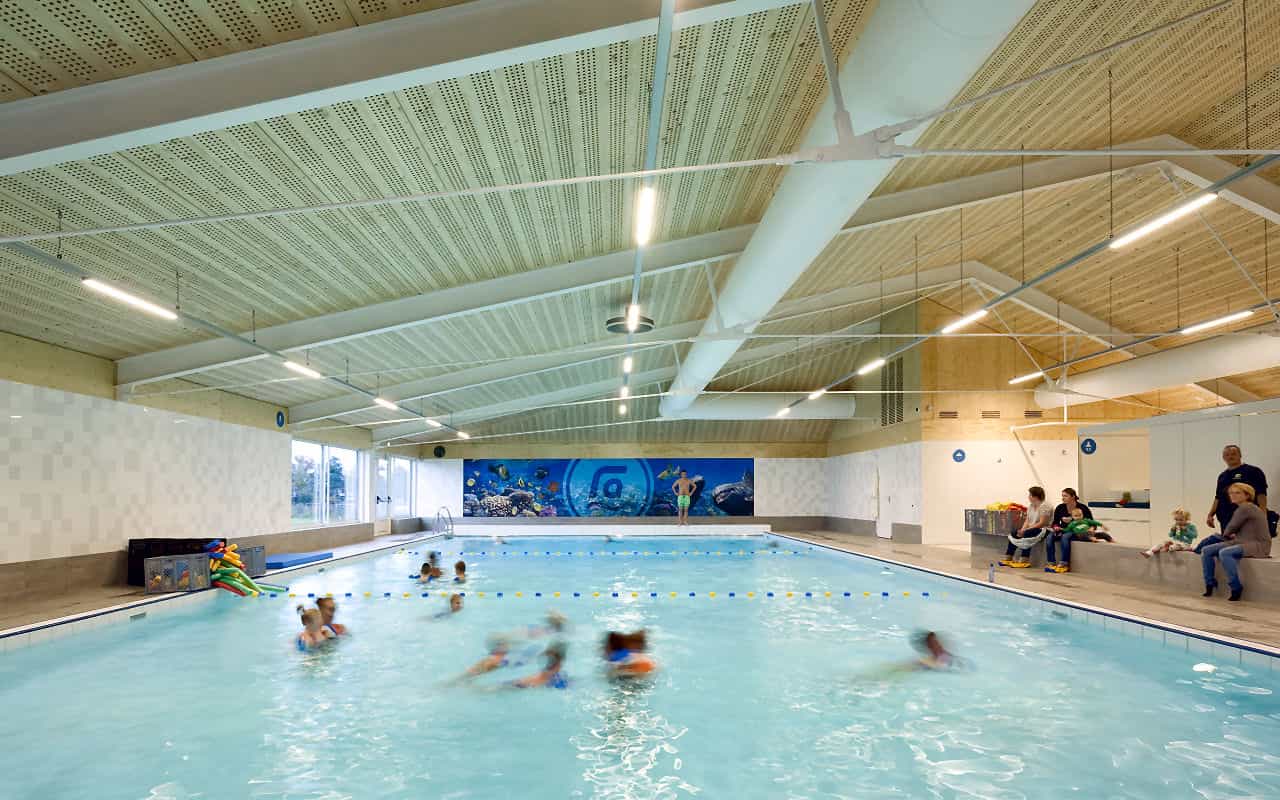Mit dezenter Bauform fügt sich die neue Schwimmhalle von Amersfoort in ihre ländliche Umgebung ein. Im Innenraum sorgt ein Holzdach aus innovativen Deckenelementen von LIGNATUR für behagliche Atmosphäre und optimale Raumakustik.