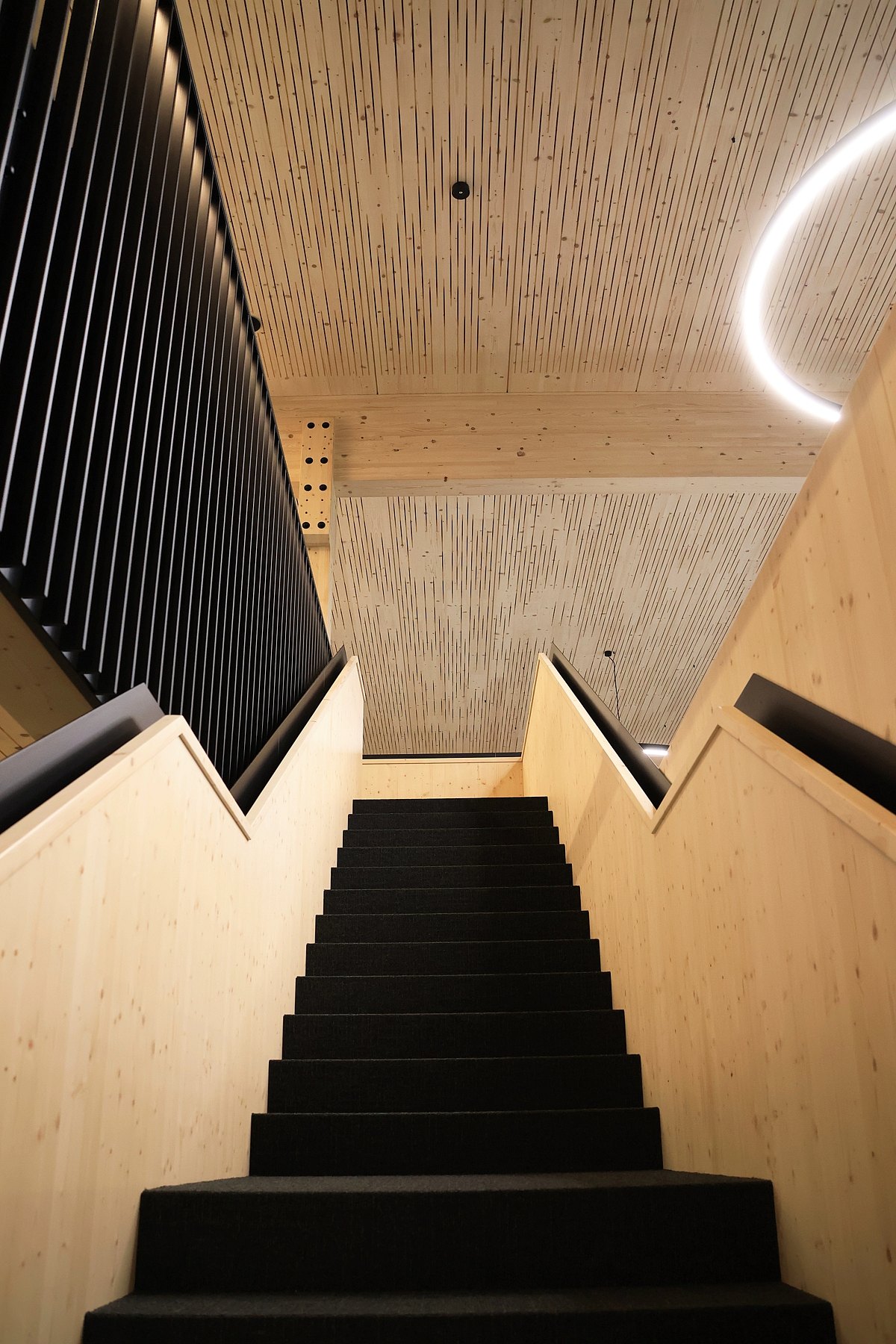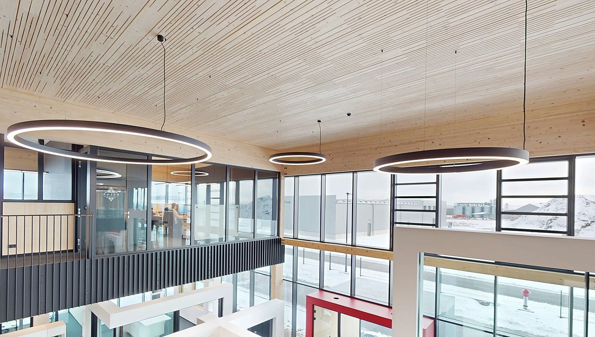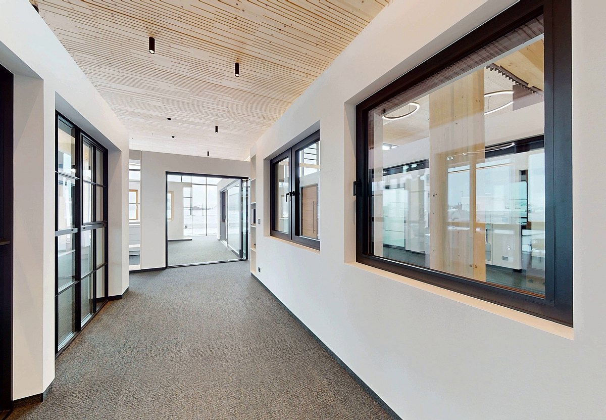 Auch das Dach der Besprechungsräume und der Ausstellung zeigt LIGNATUR-Elemente. Für die freie Spannweite von 8.4 m sind hier statisch 240 mm hohe Elemente nötig. Der Dachaufbau samt Wärmeisolation ist über dem LIGNATUR-Element platziert, wie von uns empfohlen. Die statisch tragenden Dachelemente kragen über die Fassade hinaus. Dafür sind die Elemente über der Fassade lokal gedämmt und die Fugen sorgfältig luftdicht abgeschlossen. Alle erforderlichen Vorbereitungen dafür haben wir bereits bei uns im Werk durchgeführt.