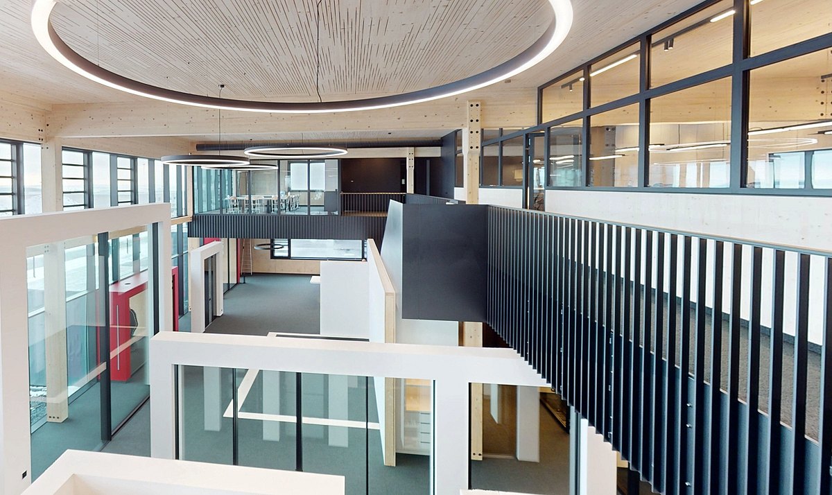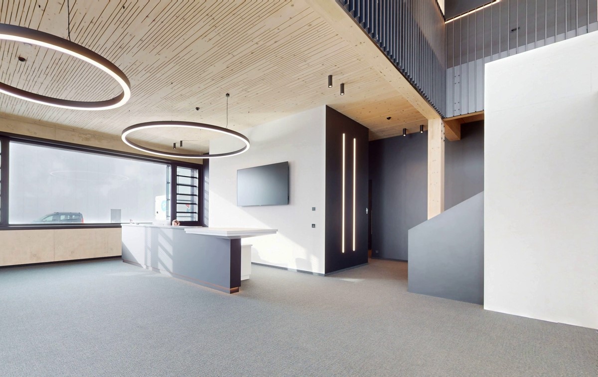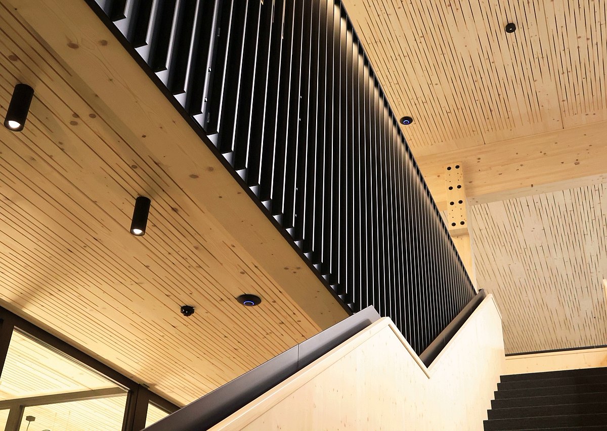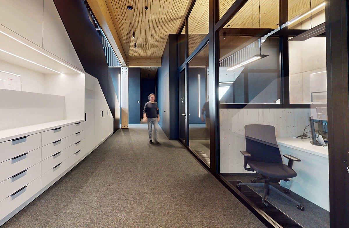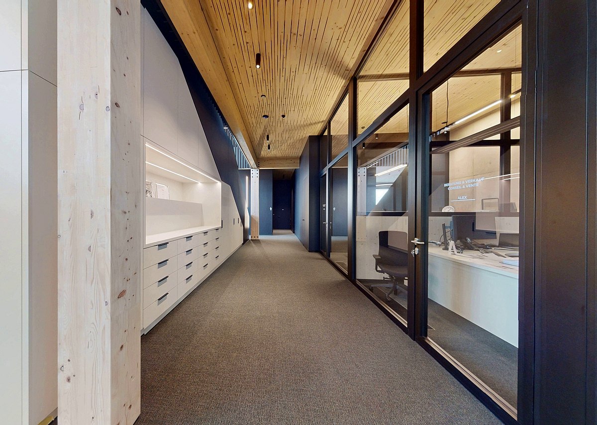 Dominique Vervoort, Geschäftsleiter und Direktor von «BREVER windows and more» zeigt eine begeisterte Hingabe zum Design, Holz und Detail. Im Rahmen des Projekts setzte er auf die vielfältigen Möglichkeiten von LIGNATUR. Die Bürozimmertrenndecken wurden mit LIGNATUR-Deckenelementen 360 mm hoch, frei gespannt über 8.4 m realisiert. Sie bieten nicht nur Stabilität, sondern auch ästhetische Holzuntersichten. Die Raumakustik wurde durch den Einsatz von Akustik Typ 8 dynamisches Design an der Elementunterseite optimiert. Die elektrischen Installationen erfolgten vor Ort entlang der Spannrichtung in werkseitig vorbereiteten Kanälen.