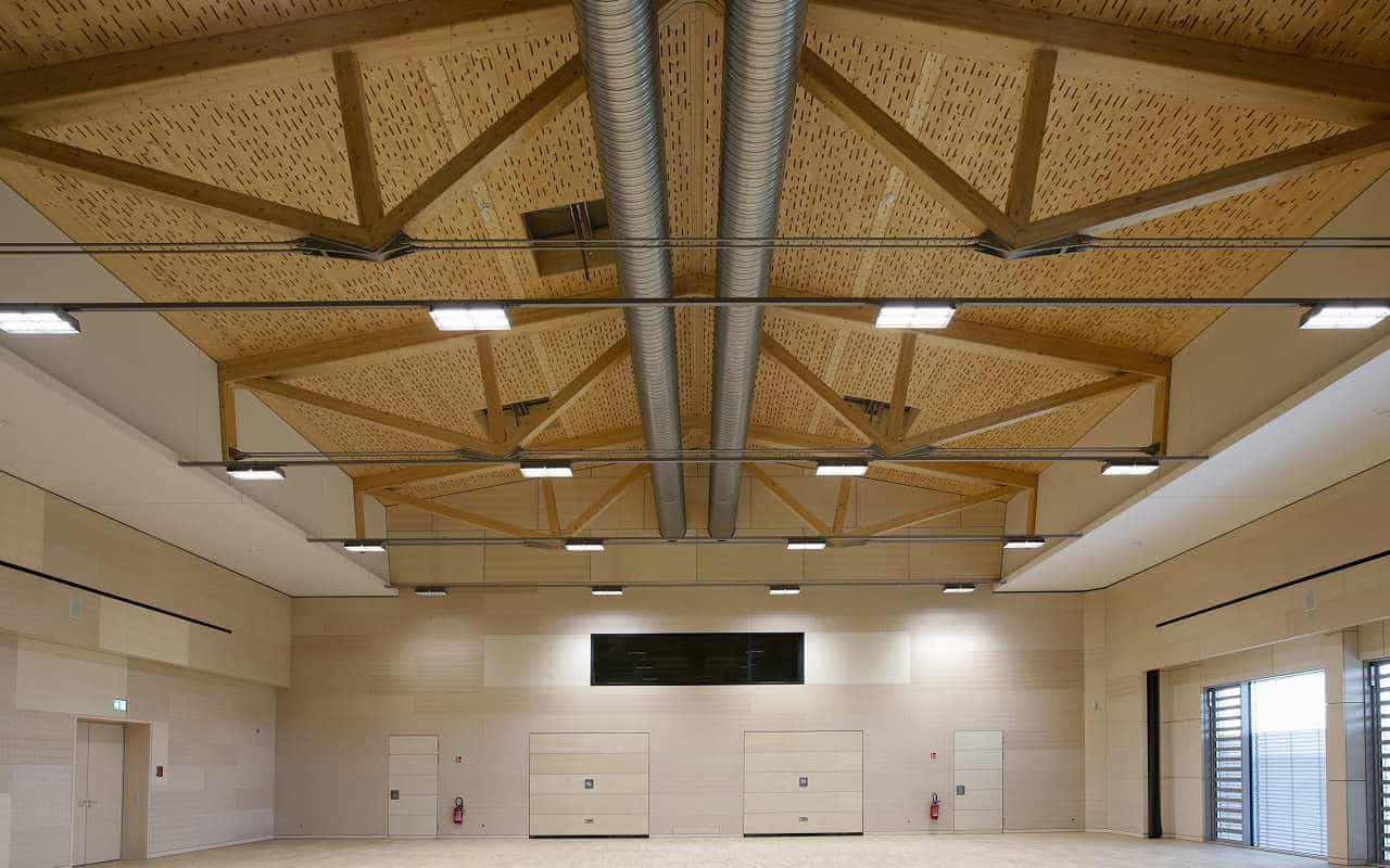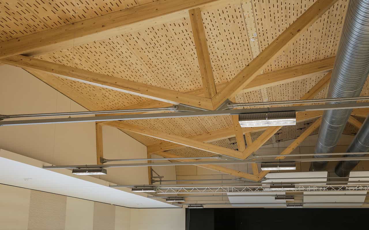 Es kamen für die Schall absorbierende Holzdeckenelemente, multifunktionale LIGNATUR Flächenelemente zum Einsatz. Sie erhöhen die Aufenthaltsqualität spürbar und sorgen ausserdem für eine gute Raumakustik mit niedrigen Nachhallzeiten. Dabei dient die perforierte Unterseite der tragenden Holzbau-Deckenelemente im Zusammenspiel mit integrierten Akustikmatten als Schallabsorber. Abgestimmt auf die akustischen Anforderungen im Multifunktionsraum, wurden Struktur und Dimensionen der Perforation individuell nach dem Design von Architekt und Bauphysiker ausgeführt. Dieses kreatives Gestaltungselement verleiht dem Raum eine eigene Identität.