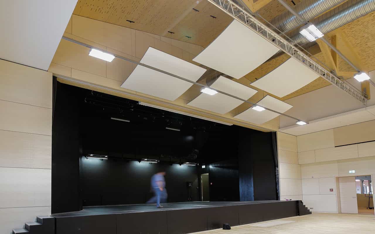 Der planerische Kompromiss sah vor, dass eine ungeübte Sprecherin bis in die Mitte des Raumes klar verstanden werden kann. Dafür wurde die Schallabsorption im vorderen Teil des Raums bewusst minimiert und verständlichkeitsfördernde Reflexionsflächen installiert. Die geometrische Ausgestaltung der Bühnenwände fördert zusätzlich primäre Reflexionen in Richtung des Zuschauerraumes und unterstützt so die Sprachverständlichkeit. Gleichzeitig nimmt die Absorptionsfähigkeit von Wänden und Decke zu, je weiter man sich von der Bühne weg bewegt – von gering absorbierend bis stark absorbierend.