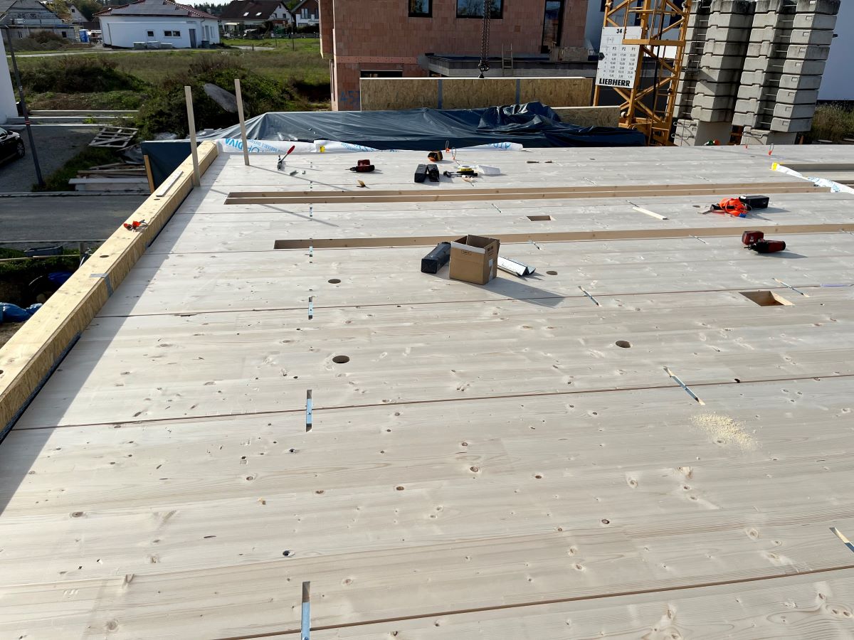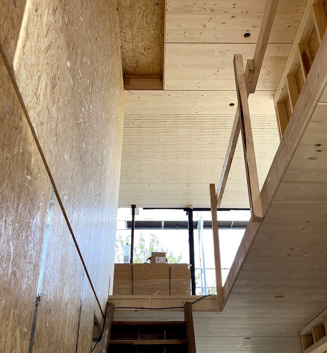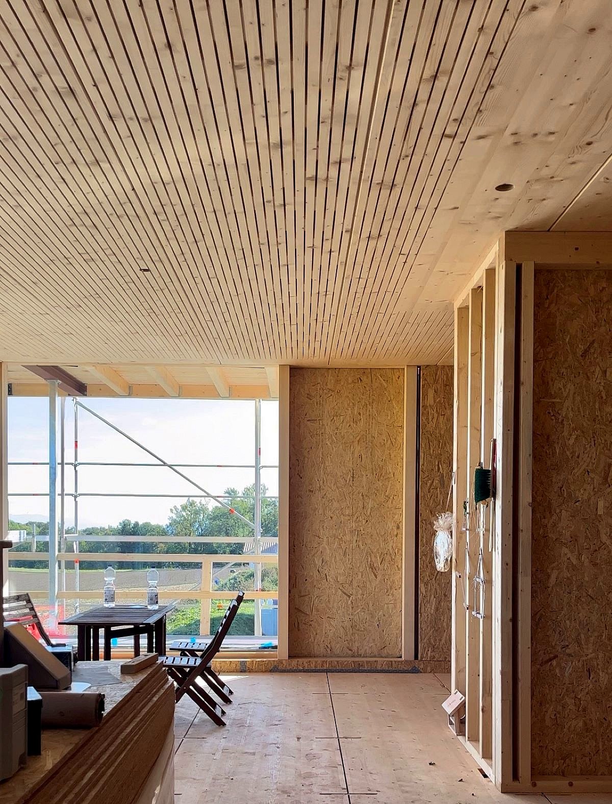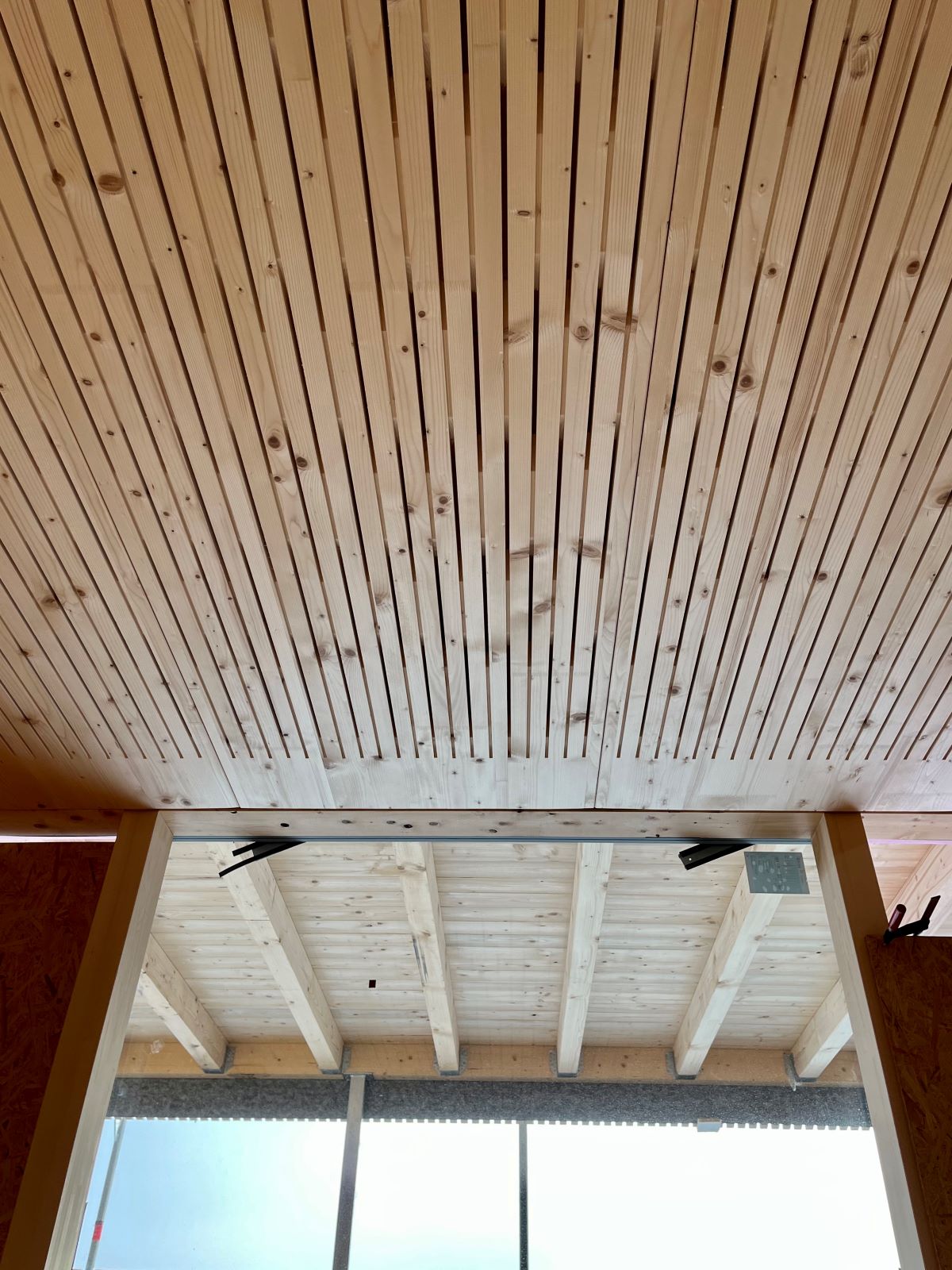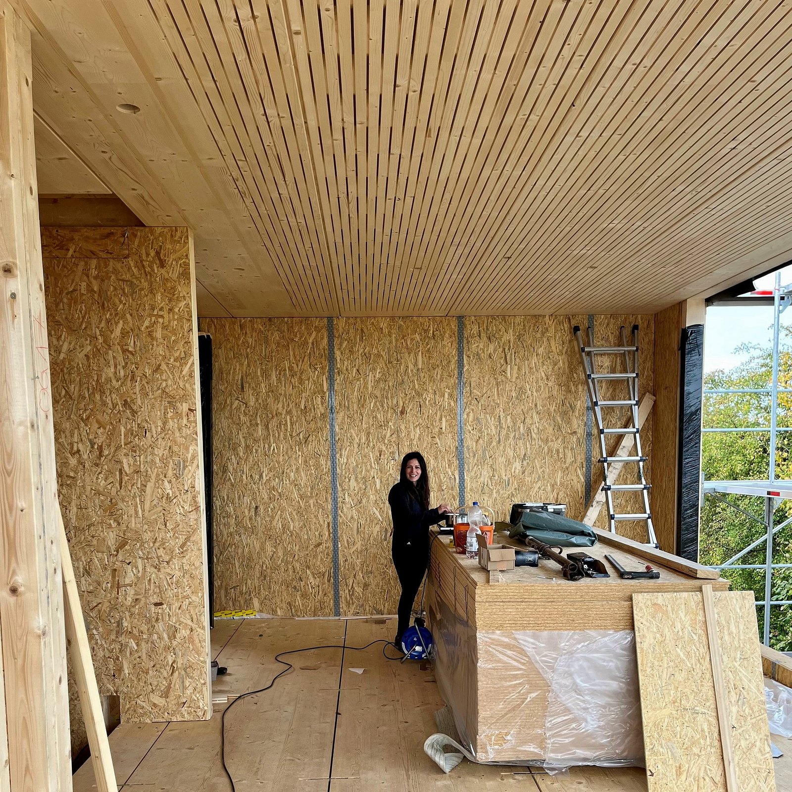 Auf ihre Decke wurde Tanja durch ihren Bauleiter aufmerksam: er arbeitet schon länger mit Lignatur zusammen und hat in seinem Büro ebenfalls eine LIGNATUR-Decke verbaut. Diese bestaunte Tanja bei ihrem ersten Besuch und noch während des Gesprächs wurde der Verbau von LIGNATUR von ihrer Seite aus besiegelt. Besonders gefiel ihr, dass sämtliche Installationen in den Hohlräumen der Decke laufen würden, die Decke zeitgleich mit dem Stellen der Wände gelegt und damit auch schon fertig sein würde.
