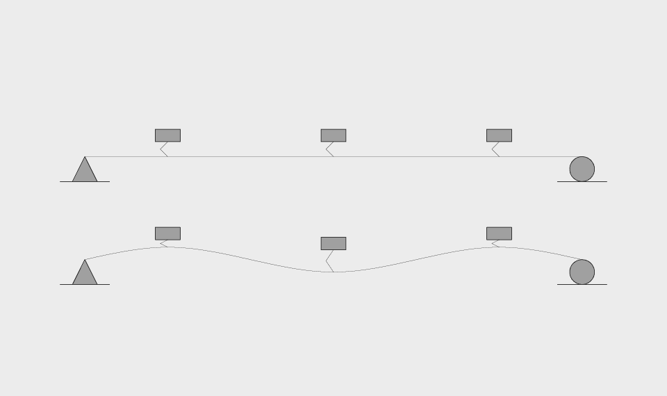 Durch das Begehen wird die Decke angeregt. Tieftontilger, träge Massen auf Federn minimieren die Abstrahlung bei 50 Hz, der 2., 3. oder 4. Eigenfrequenz. Hier im Beispiel ist die 3. Eigenfrequenz gezeigt.